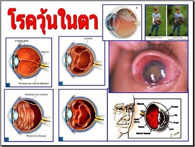โรควุ้นในตาเสื่อม...คืออะไร อาการโรควุ้นในตาเสื่อม จะทำให้เราจะมองเห็นจุดหรือเส้นรูปร่างต่างๆ เช่น คล้ายหยากไย่ลอยไปมา เหมือนคราบที่ติดกระจกนั่นแหละ จะเห็นชัดม...ากขึ้นเมื่อมองไปยังบริเวณที่มีสีสว่าง เช่น ท้องฟ้าขาวๆ ฝาห้องขาวๆ จะเห็นเป็นคราบดำๆ ลอยไปลอยมา จุดหรือเส้นเหล่านี้เกิดจากขณะที่น้ำวุ้นตาละลาย บางส่วนจะจับตัวกันเป็นตะกอน ซึ่งถ้าเป็นมากโดยมีอาการเห็นแสงคล้ายฟ้าแล่บแปล๊บ ๆ ในเวลาค่ำหรือในที่มืด จะแสดงถึงอันตรายสุด ๆ ซึ่งถ้าปล่อยไว้ไม่รักษา อาจทำให้จอประสาทตาฉีกขาด ถ้าไม่รักษาก็อาจทำให้ตาบอดได้เช่นกัน สาเหตุโรควุ้นในตาเสื่อม
